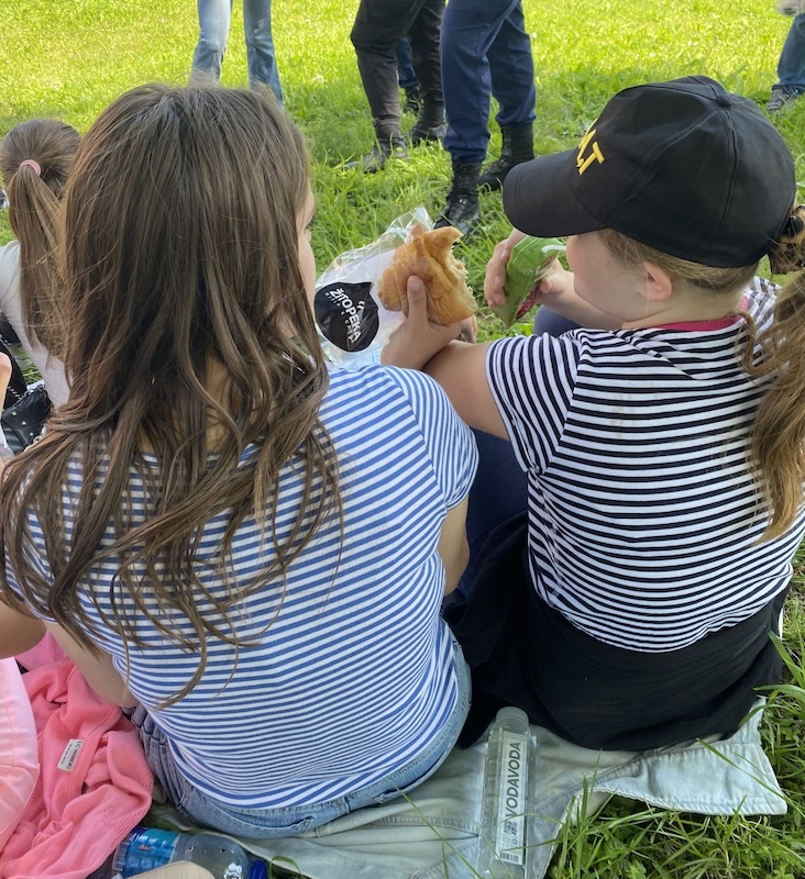 Nakon toliko uzbuđenja, dobro je došao predah u hladu – mali piknik sa kroasanima i sokovima, gdje su djeca i volonteri podijelili utiske i uživali u zajedničkom vremenu. Dan je završen sportskim aktivnostima u sali, gdje su djeca učestvovala u organizovanom takmičenju uz mnogo smijeha i pozitivne energije.